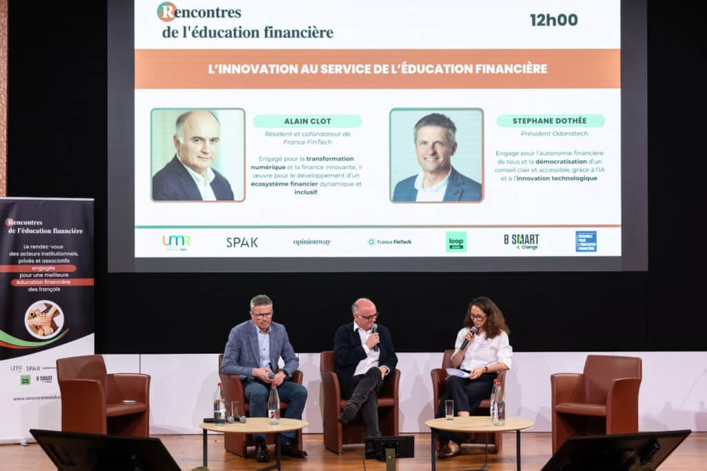 Alain Clot, Président de France Fintech, et Stéphane Dothée, CEO d’Odonatec, ont clôturé les échanges de la matinée avec une synthèse sur l’innovation : inclusion financière, régulation et technologies éducatives. Ils ont montré que l’innovation complète l’accompagnement humain sans le remplacer, et que les outils numériques peuvent rendre l’éducation financière accessible, conversationnelle et personnalisée.